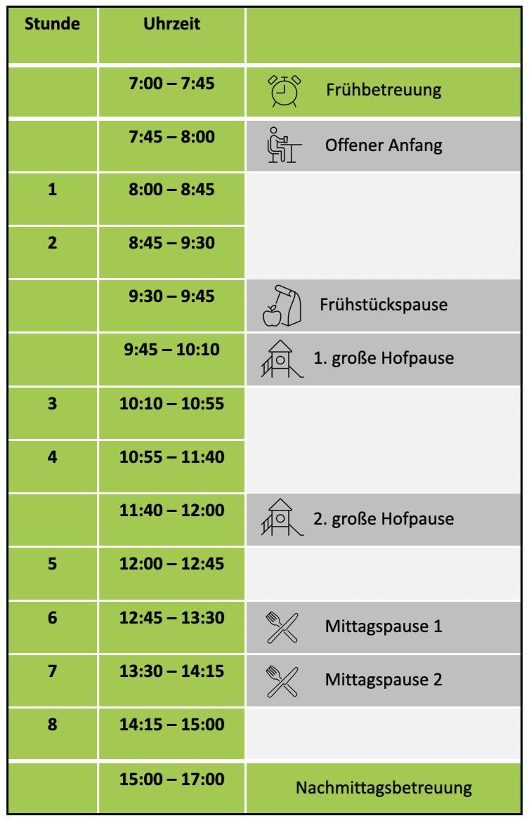Der Unterricht endet nach Stundenplan; bei vier Stunden nach der 2. großen Pause um 12 Uhr.